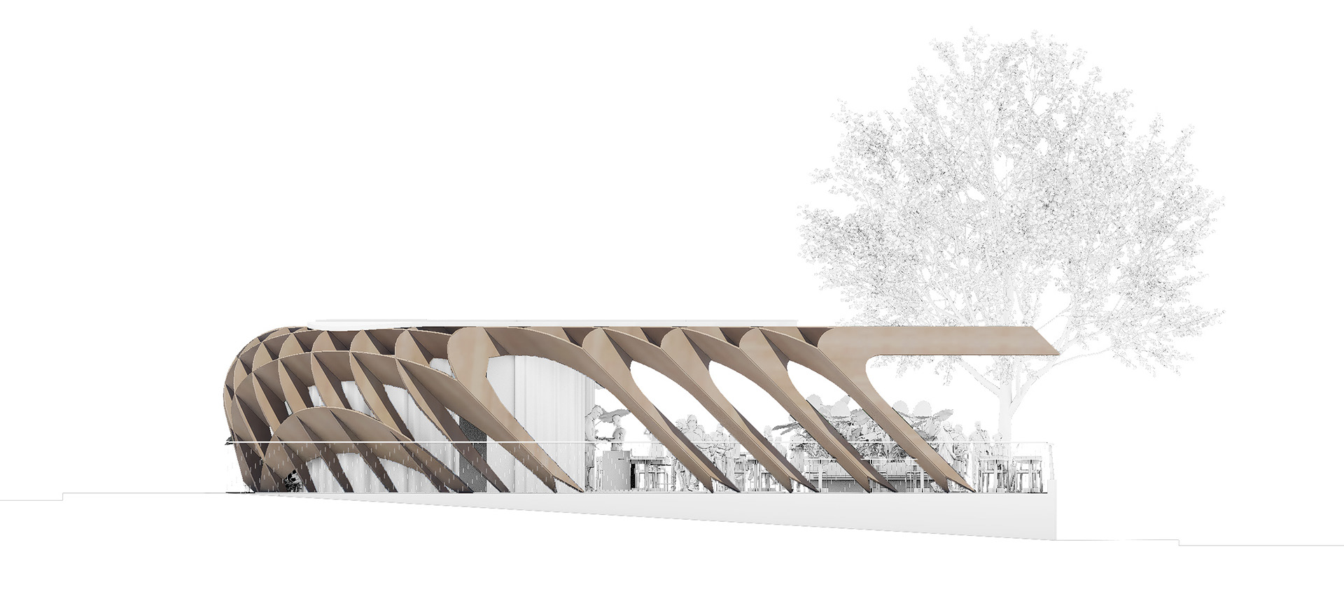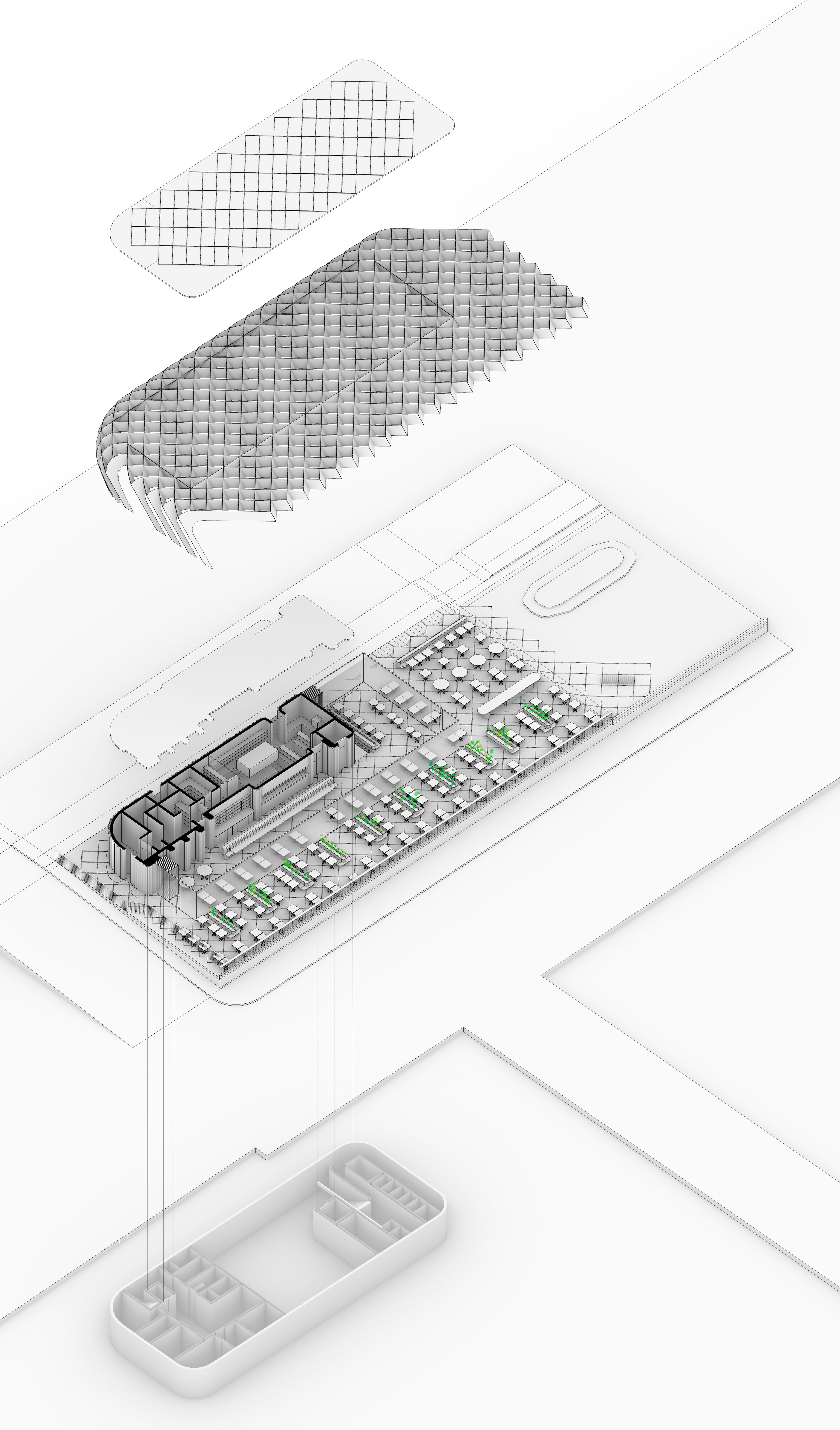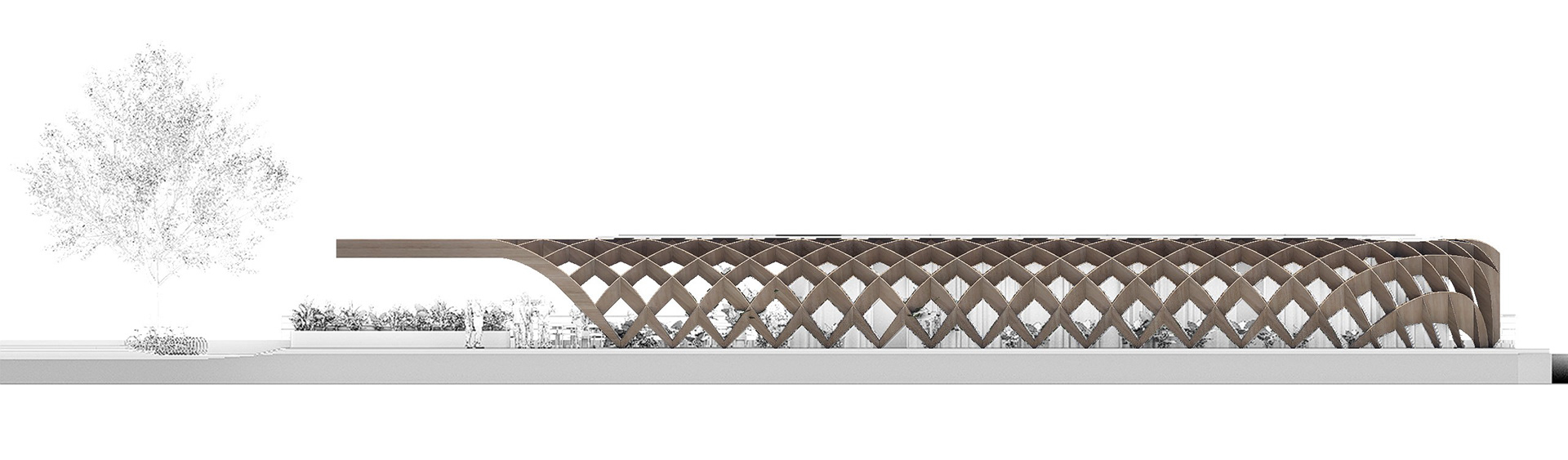El volumen se articula mediante una retícula de madera que da lugar a una gran pérgola continua, curva en sus extremos y recortada en planta para ajustarse a la geometría del solar. Esta celosía tridimensional configura una zona cubierta que alberga zonas de estancia, restauración y vegetación, generando un nuevo lugar de encuentro para residentes y visitantes.