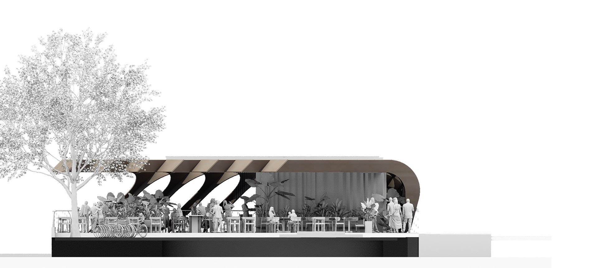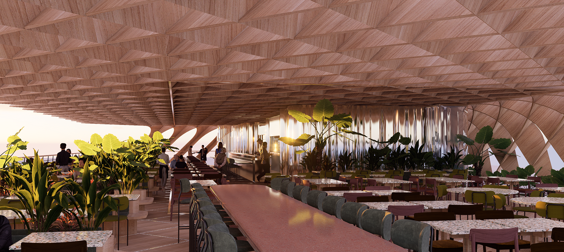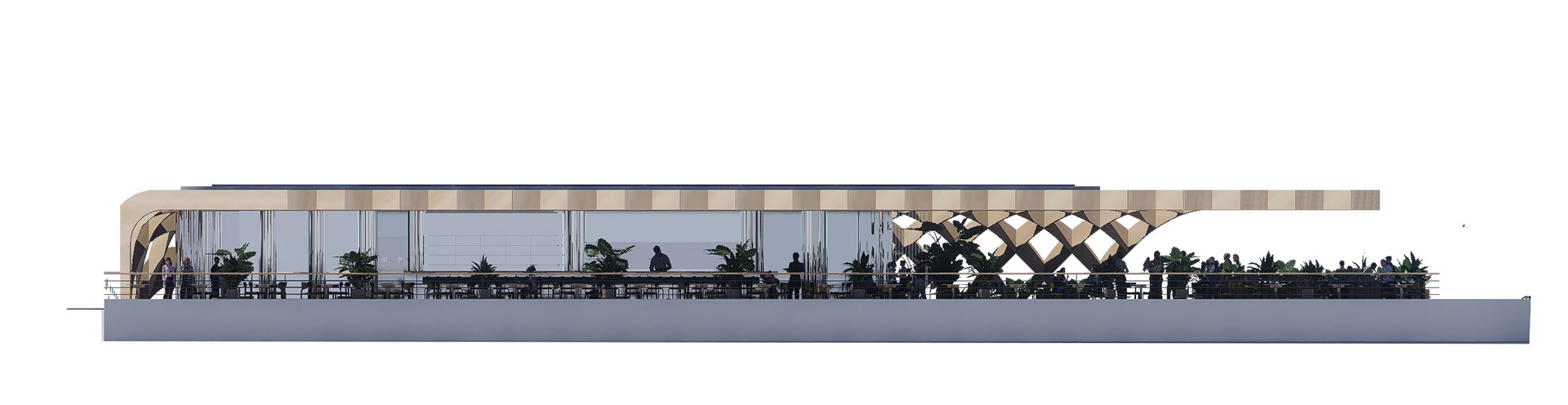 El volumen se articula mediante una retícula de madera que da lugar a una gran pérgola continua, curva en sus extremos y recortada en planta para ajustarse a la geometría del solar. Esta celosía tridimensional configura una zona cubierta que alberga zonas de estancia, restauración y vegetación, generando un nuevo lugar de encuentro para residentes y visitantes.