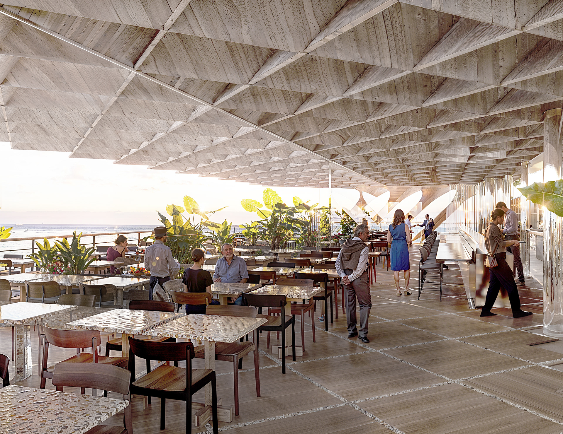La cubierta se curva tanto en sección como en planta, con un diseño que permite canalizar visualmente las vistas hacia el entorno portuario y el centro histórico. La retícula crea zonas de sombra a diferentes horas del día, mejorando el confort ambiental.