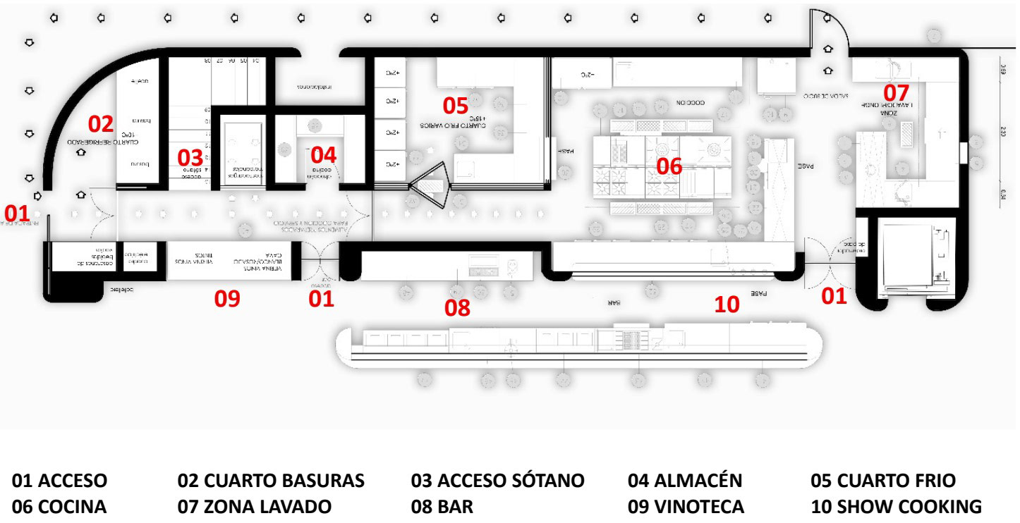 Se plantea una cocina profesional con la dimensión adecuada para el número de mesas a las que se debe atender. La configuración de la cocina, tantos los diferentes espacios como la relación con el acceso y distribución de mercancías, el recorrido de camareros, etc. ha sido generada en colaboración con expertos para asegurar una perfecta funcionalidad.