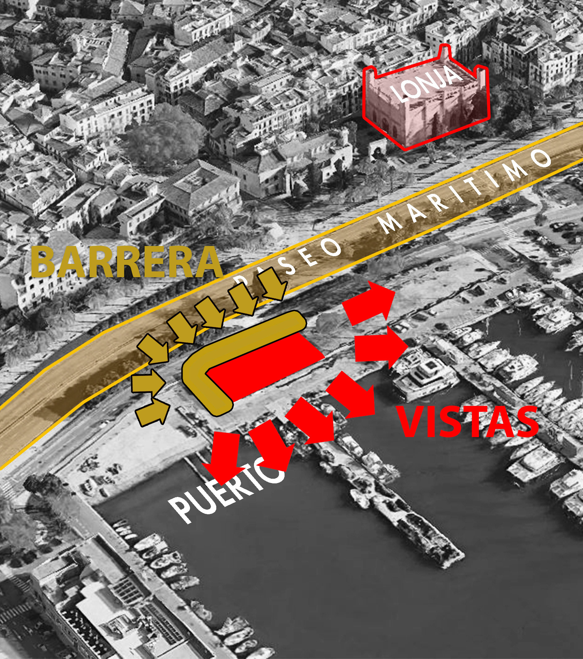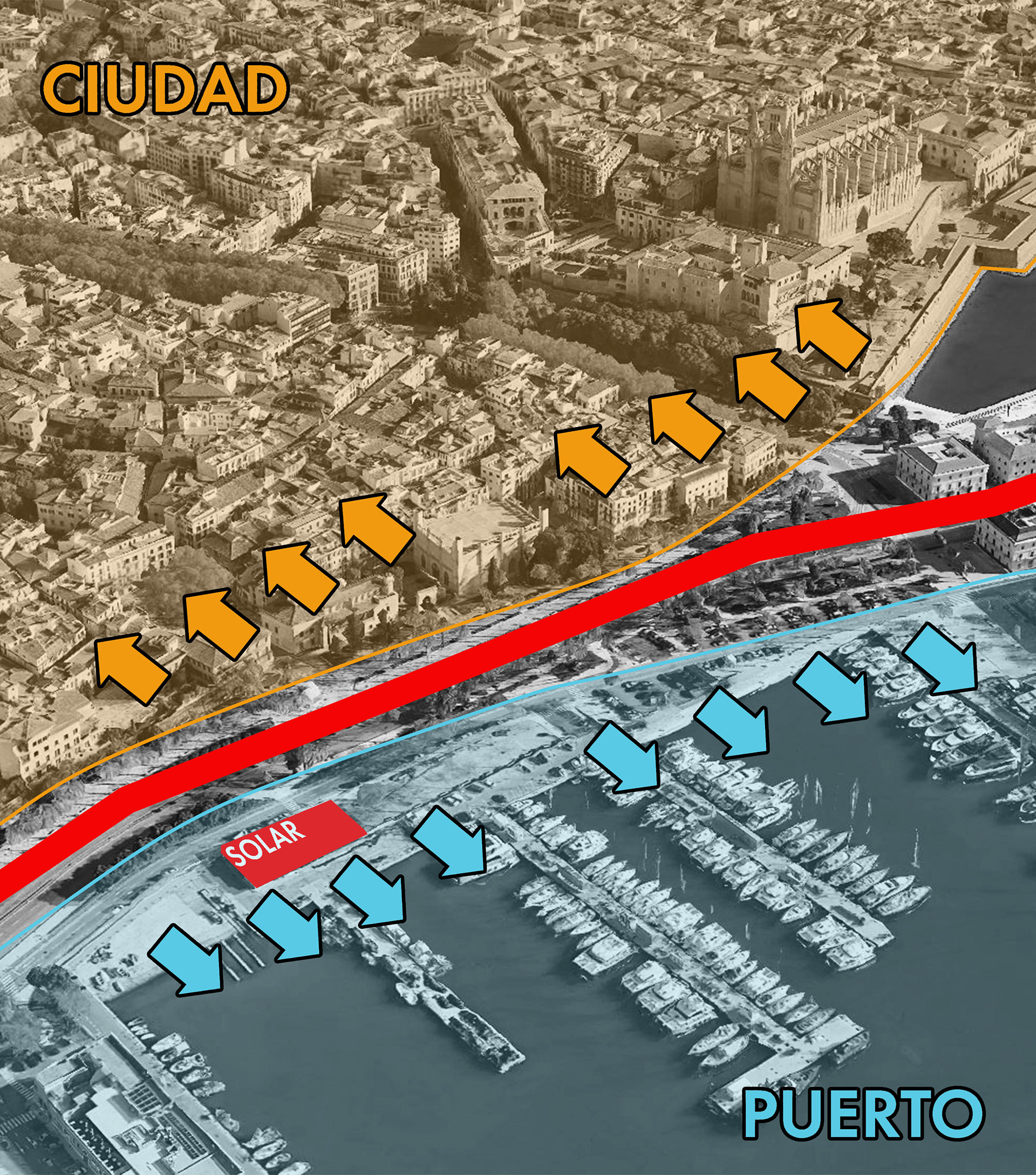 Este proyecto propone la creación de una gran cubierta ligera y permeable que redefine el espacio público en el entorno del puerto de Palma de Mallorca. La intervención genera un espacio sombreado, permeable, vegetal y abierto a los ciudadanos, redefiniendo la relación entre el paseo marítimo, el mar y el casco histórico de la ciudad.