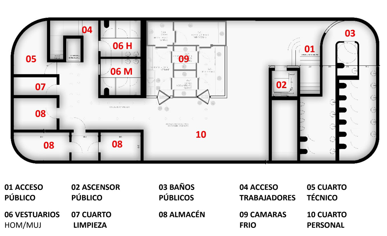 La planta sótano constituye un espacio técnico y logístico esencial para el funcionamiento del restaurante. Se destina principalmente a zonas de almacenamiento alimentario, cámaras de conservación, servicios del personal, instalaciones generales y logística de mercancías.