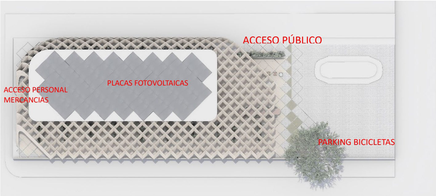 Por encima de la pérgola, en el ámbito cubierto, se colocará un sistema de placas solares fotovoltaicas que permitirán amortiguar la demanda energética producida por el restaurante.