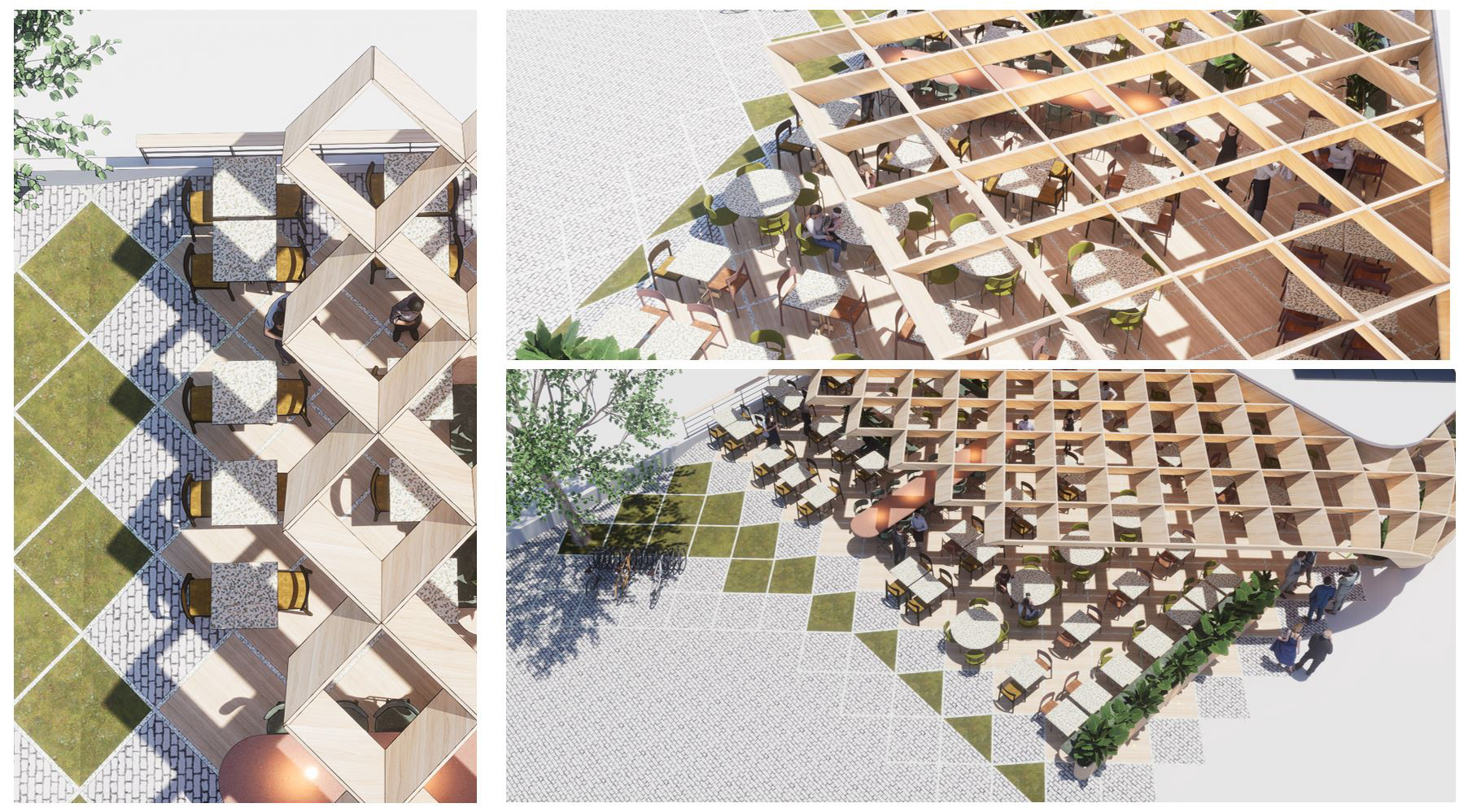 En el interior de estos rombos, se colocarán diferentes materiales: madera en las zonas de restaurante y zonas verdes en los límites. La idea que se propone es extender estos rombos un poco hacia el espacio del muelle, de tal manera que el tablero se perciba como una extensión de la zona del muelle.